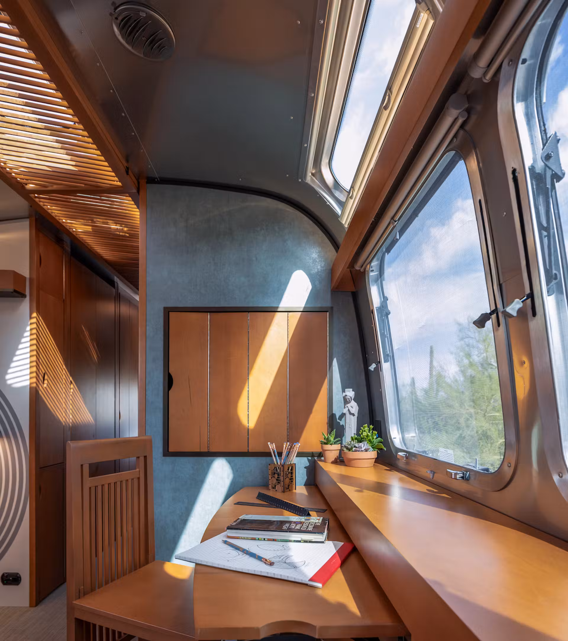 A specific emphasis was also placed on filling the space with light. Overhead storage capacity was relocated to allow for more windows and natural light to flow into the unit. Two circular porthole windows also give a nod to Wright’s love of circular elements and Airstream’s dedication to rounded aerodynamic design.