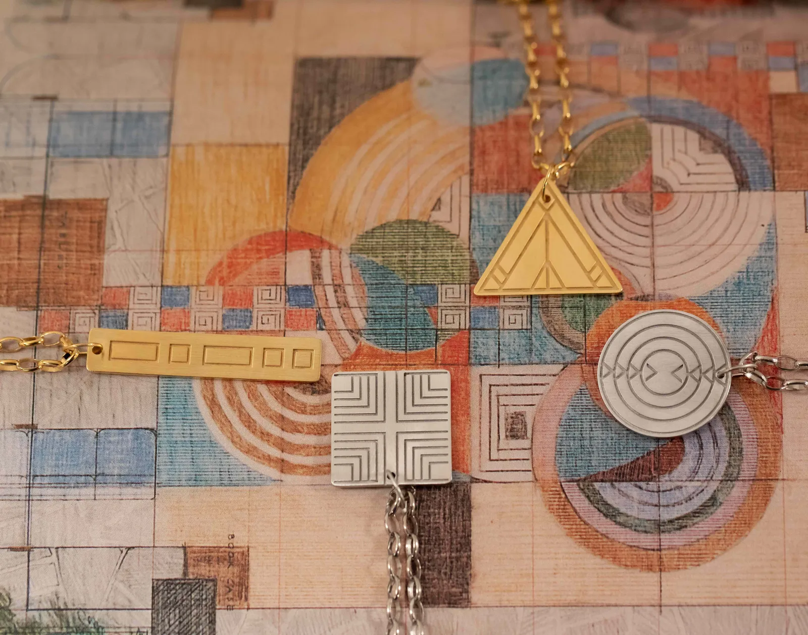 “They literally hand over a library of design resources, there’s lots of material in there,” says jewelry designer Maya Brenner, who released a capsule collection in collaboration with the foundation this October. Using this archive, Brenner was able to find inspiration for necklaces and earrings in two places: Wright’s skylights and his “Organic Commandment,” a print originally issued in 1934 through Taliesin Press. From these muses, she created the Virtues Collection, a series of four necklaces displaying a word from Wright’s commandment on geometric shapes the architect was known for, and the Racine Collection, a necklace-and-earring set with pendants inspired by the skylight in the SC Johnson Administrative Building.
