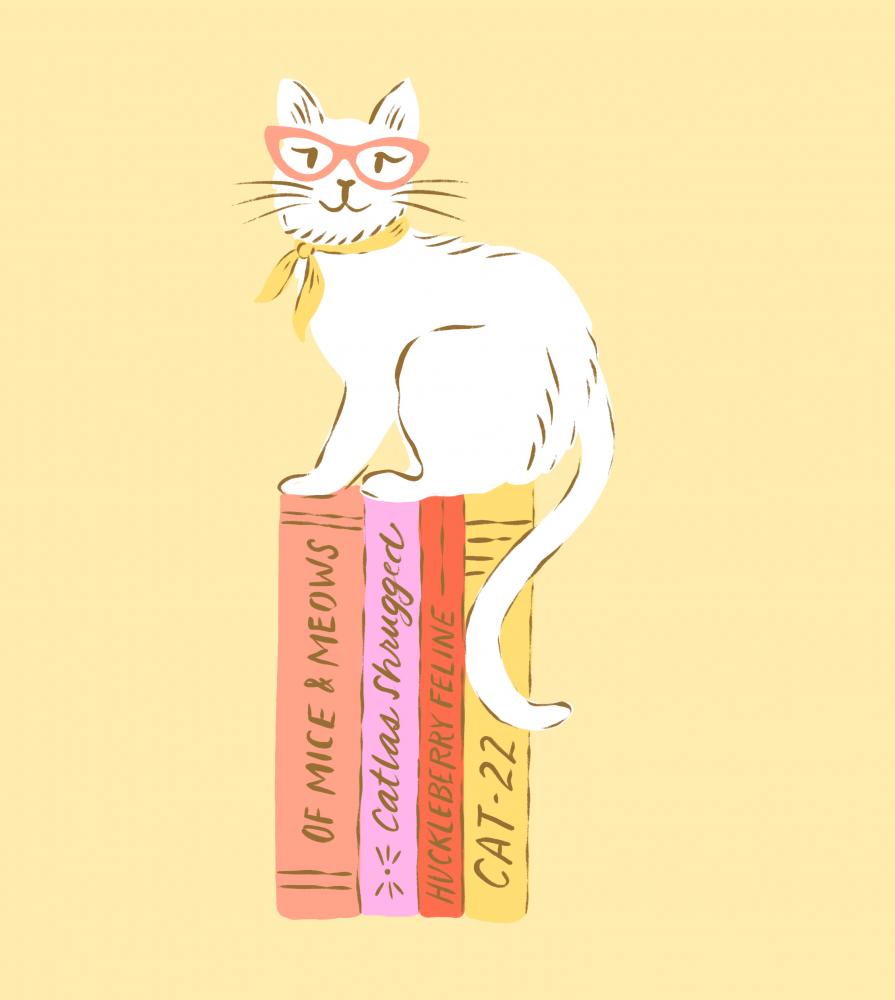 Key Icons: Stacked books + spines / Ornate book covers / Bookmarks + library ephemera / Cozy pet companions / Reader culture phrases / Classic titles