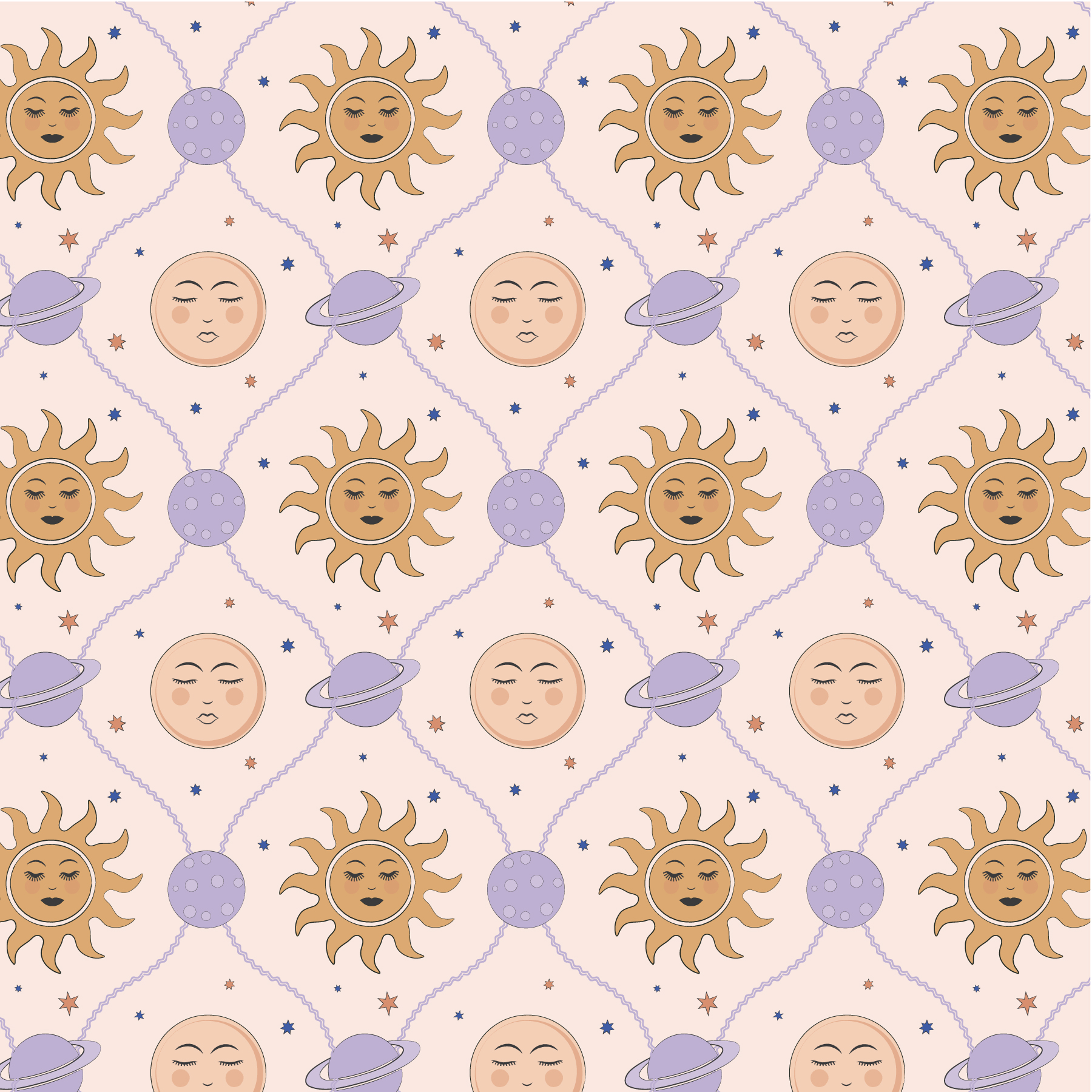 Key icons: Sun + moon faces / Sunbursts / Stars / Planets / Crescents / Zodiac + fortune cues / Cosmic patterns / Framing botanicals